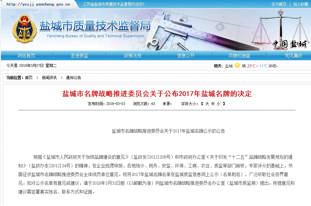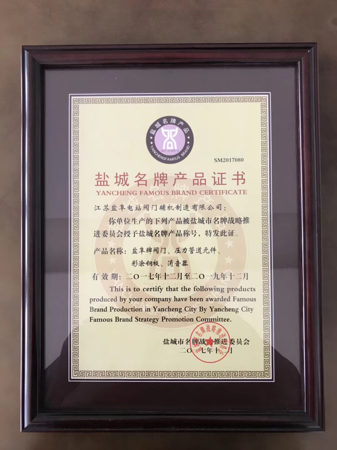 2018年3月23日,鹽城市質量技術監(jiān)督局公示了《鹽城市名牌戰(zhàn)略推薦委員會關于公布2017年鹽城名牌的決定》,江蘇鹽阜電站閥門輔機制造有限公司所申報的閥門、壓力管道元件、彩涂鋼板、消音器共四項產品均榮獲了鹽城市名牌產品的稱號。