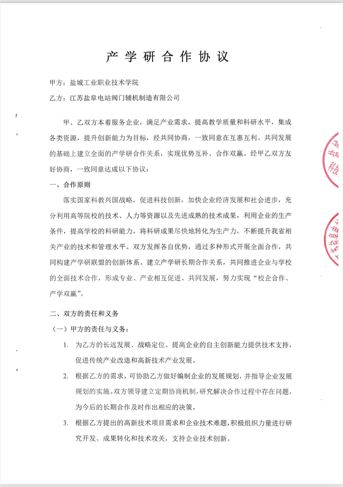 近期,公司與鹽城工業(yè)職業(yè)技術(shù)學(xué)院簽訂了產(chǎn)學(xué)研合作協(xié)議。雙方本著服務(wù)企業(yè),滿足產(chǎn)業(yè)需求,提高教學(xué)質(zhì)量和科研水平,集成各類資源,提升創(chuàng)新能力為目標(biāo),經(jīng)共同協(xié)商,一致同意在互惠互利、共同發(fā)展的基礎(chǔ)上建立全面的產(chǎn)學(xué)研合作關(guān)系。