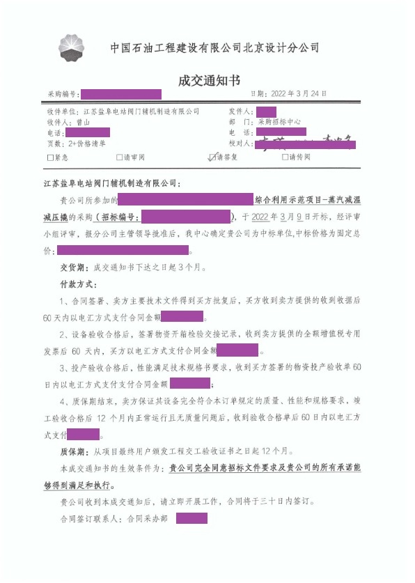 2022年3月24日,中國石油工程建設(shè)有限公司北京設(shè)計分公司宣布我公司為中石油某資源化綜合利用示范項目-蒸汽減溫減壓撬設(shè)備的中標(biāo)單位,并向我公司發(fā)送了成交通知書。中國石油工程建設(shè)有限公司北京設(shè)計分公司隸屬于2021年《財富》世界500強排名第4位的中國石油天然氣集團有限公司,年營收約2840億美元,總資產(chǎn)約6266億美元。公司之前已經(jīng)在一些包括輝騰石化在內(nèi)的中石油項目上有過良好的供貨業(yè)績,也曾經(jīng)為中石油旗下位于哈薩克斯坦的中油阿克糾賓油氣股份有限公司提供過優(yōu)質(zhì)的閥門以及減溫減壓裝置產(chǎn)品,此時中標(biāo)也說明了我公司的減溫減壓裝置產(chǎn)品再一次得到了世界級巨頭的認可。截止目前,公司累計服務(wù)的世界500強客戶已經(jīng)超過了50家,業(yè)績覆蓋了包括中石化、中海油、國家電網(wǎng)、國家電投、國家能投等大部分的能源類央企。
