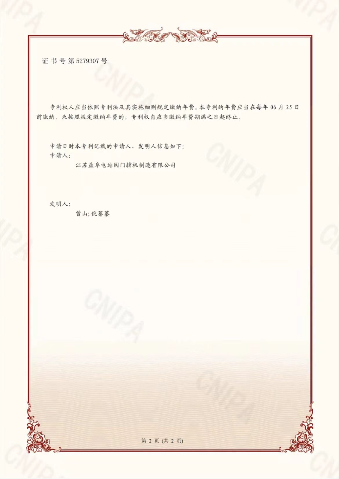 近日,江蘇鹽阜電站閥門輔機制造有限公司(以下簡稱“公司”)收到1項國家知識產(chǎn)權(quán)局頒發(fā)的《發(fā)明專利證書》,具體情況如下: