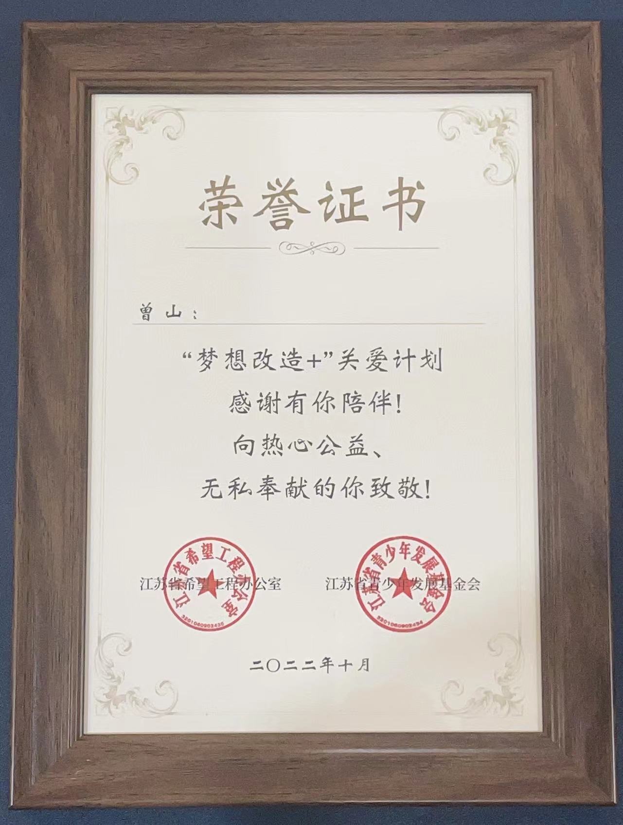 2022年10月,公司總經(jīng)理曾山收到了江蘇省希望工程辦公室及江蘇省青少年發(fā)展基金會頒發(fā)的榮譽證書,以表彰其在“夢想改造+”關(guān)愛計劃中所作出的貢獻。“夢想改造+”關(guān)愛計劃是共青團江蘇省委為深入貫徹習(xí)近平總書記對希望工程重要寄語精神,積極探索團組織服務(wù)鄉(xiāng)村振興大局的新舉措。共青團江蘇省委聚焦了全省萬名“事實孤兒”,啟動實施“夢想改造+”關(guān)愛計劃,利用2021-2022年2年時間,募集12億元善款,建設(shè)10000間“夢想小屋”,為“事實孤兒”群體提供常態(tài)服務(wù)。公司總經(jīng)理曾山通過該計劃為鹽城市鹽南高新區(qū)的“事實孤兒”定向捐贈了數(shù)間“夢想小屋”。