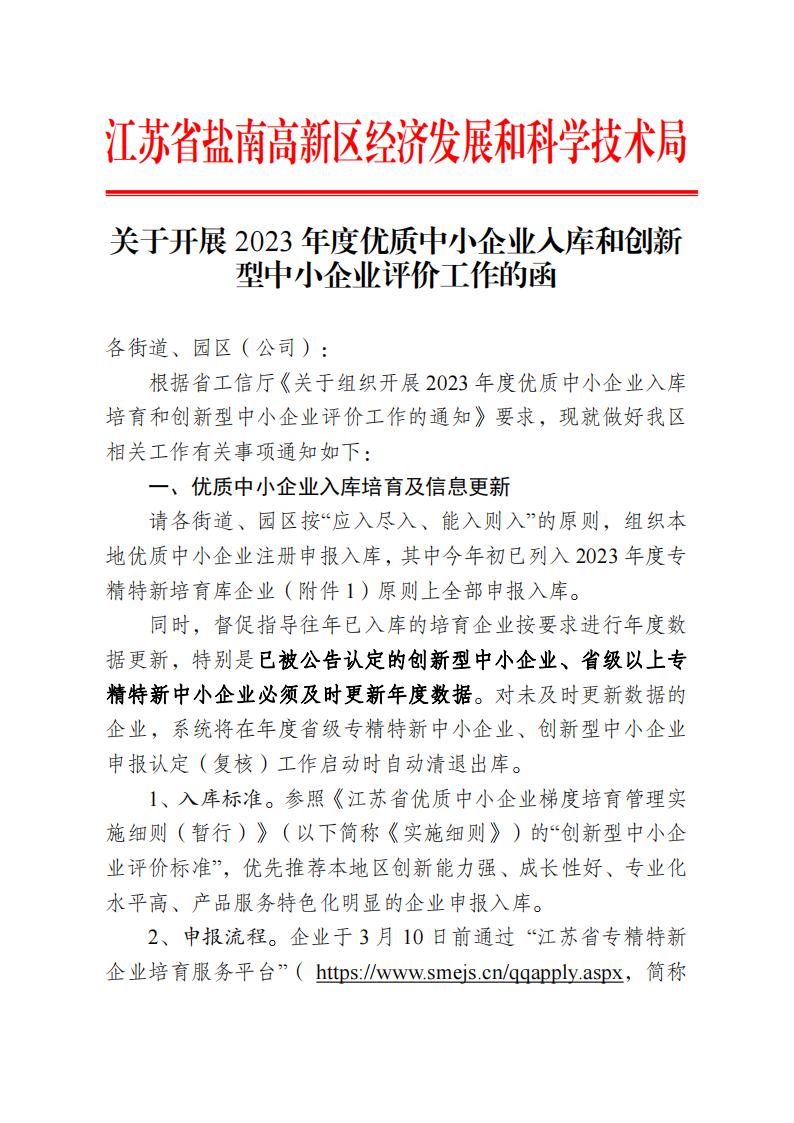 圖1: 《關(guān)于開展2023年度優(yōu)質(zhì)中小企業(yè)入庫和創(chuàng)新型中小企業(yè)評(píng)價(jià)工作的函》Page1