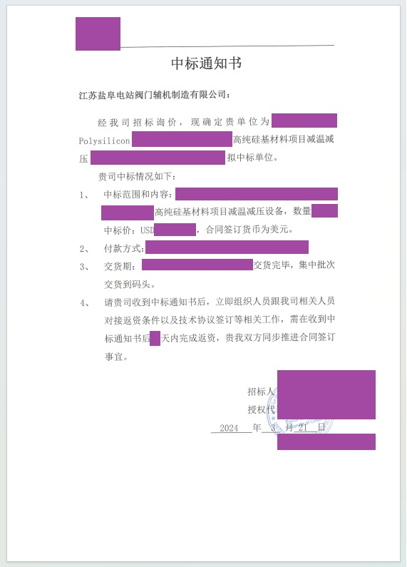 圖1:中東項目減溫減壓裝置中標通知書 |