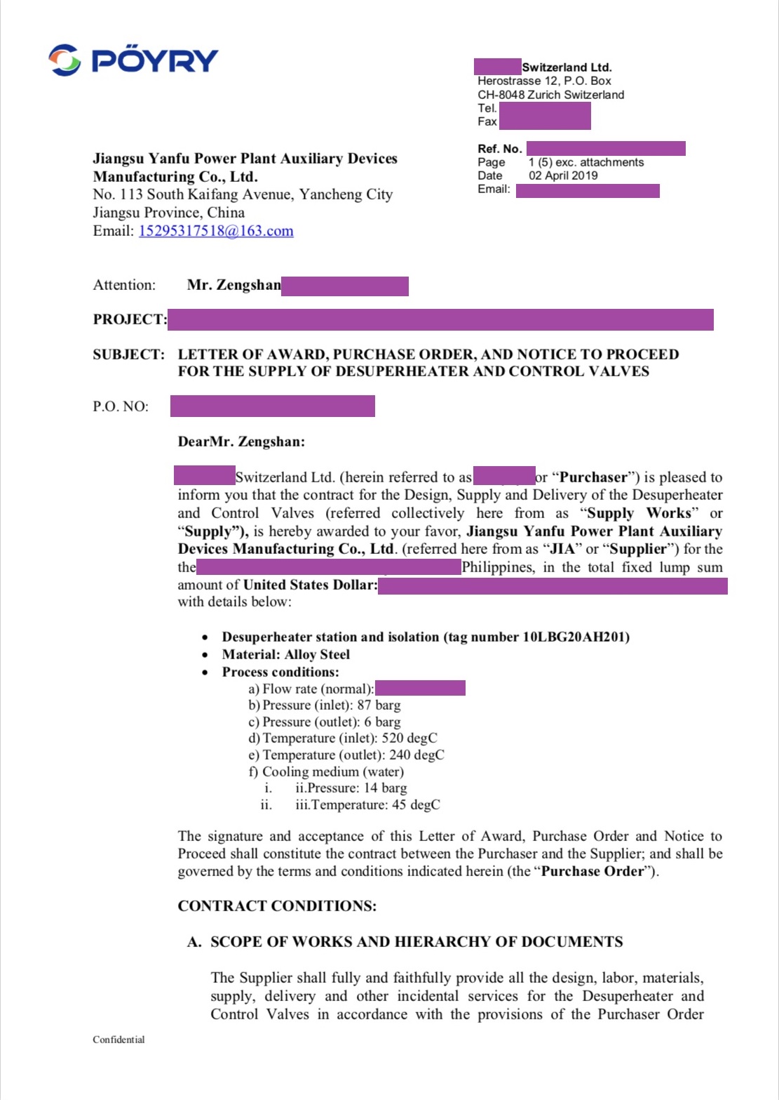 POYRY瑞士公司NNBP項(xiàng)目減溫減壓裝置